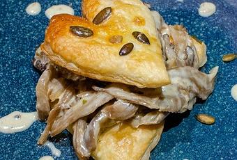 Monter les vol-au-vent: une couche de pâte feuilletée, une belle quantité d'effiloché de pleurotes, et terminer par un 'chapeau' de pâte.