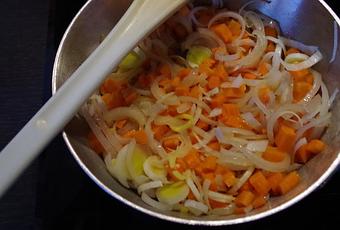 Emincez l'oignon et le poireau, puis coupez les carottes en dés.
