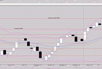 Les tensions géopolitiques, le retour à la hausse des bons du trésor américain la semaine dernière avaient ralenti la progression du CAC 40 par une semaine baissière de 1,44%.La structure en harami formée en l'occasion pouvait éventuellement prolonger la correction de la hausse du mois de janvier; il n'en est rien puisque le CAC est venu en cette fin de semaine au contact de son sommet historique de janvier 2022.Avec une hausse de 3,06%, le marubozu blanc fait apparaître une importante structure en trois méthodes haussière qui va permettre le franchissement de l'obstacle des 7385 points.A l'image des 2 dernières séances de la semaine, cet évènement "mérite" une certaine hésitation laquelle, au cas où elle se prolongeait, pourrait entraîner un repli vers les 7247 points avant reprise de la hausse.A noter que les petites valeurs (CAC Small) restent encore en retrait avec une hausse hebdomadaire de 0,58% mais pourraient toutefois à la fin de ce mois de février voir leur indice de référence passer en tendance haussière de moyen terme.Si l'ensemble des indices de l'Eurozone ont été orientés à la hausse cette semaine, les principaux indices américains restent encore en baisse cette semaine (0,28% pour le S&P 500 et 0,13% pour le Dow Jones). Seul le Nasdaq Composite affiche une hausse modérée de 0,59%.