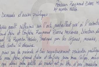 Eric Clovis Zibi Atangana demande publiquement pardon à Raymond Barre Mekamba et à tous ceux qui ont été insultés et villipendés dans son article de presse. Il se dit prêt à suivre scrupuleusement la déontologie de leur métier et à éviter de porter atteinte à l’intégrité physique et morale de son confrère et de toutes les personnes qui lui sont chères.