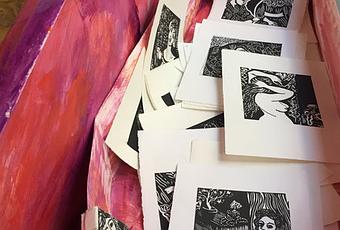 Laura Loriers continue de me surprendre. Voilà cinq ans, en février 2017, je découvrais une pluie de couteaux (les coquillages) à l’Espace Christiane Peugeot, à Paris. Depuis, je regarde son travail, je la suis quand elle part au Japon (elle envoie des lettres). Elle en revient et, soudain, déménage, quitte la région parisienne et s’engage dans la région où elle s’installe. Elle et son mari y plantent des arbres (je pense à La Vallée de Fabrice Hyber). Et elle découvre Suzanne Valadon. Son travail alors est d’approcher cette oeuvre, cette artiste, cette femme. Il ne s’agit pas, pour elle, de copier ; Suzanne Valadon peint ou dessine, Laura Loriers fait des gravures, et cette fois plutôt en noir et blanc. Par cette activité même, elle apprend, elle prend modèle, c’est-à-dire que ses modèles sont ceux et surtout celles de Valadon. « En miroir », me dit-elle. C'est un peu vrai, mais c'est plus que ça : elle redonne une sorte d'existence par-delà la mort (la photo ci-contre réunit quelques gravures dans un cercueil réalisé par Isabelle Laurent Brion). Elle ajoute des mots, comme une correspondance. Et cette exposition, qui s’est terminée le 26 février 2023, invitait à révéler, sous le titre manuscrit, la gravure puis une reproduction du tableau de Valadon d’où le personnage est sorti, et parfois un texte plus long, une lettre… Une conférence « en tête à tête avec Valadon », avec Mathilde Guégan, s’est déroulée le samedi 25, conclue par une visite de l’atelier de l’artiste. Nous n’en sommes qu’au début.