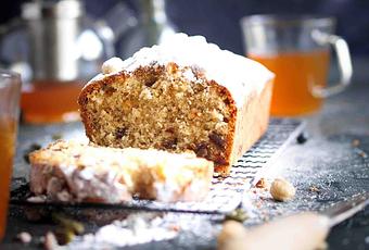Tapissez un moule à cake de papier sulfurisé, coulez la pâte, ajoutez des noisettes et des pistaches. Faites cuire 40 minutes. Vérifiez bien la cuisson avec la pointe d'un couteau.