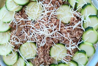 2° Ajoutez les morceaux de courgette sur la galette en suivant son pourtour par exemple. Continuez en déposant les miettes de thon.