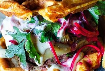 Monter les burgers: 1 gaufre comme base, tartinée de sauce, poser un burger, une tranche d'oignon, cornichona, salade, légumes marinés, etc... Terminer par une gaufre tartinée de sauce.