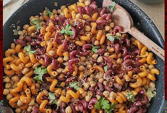 Pour 4 personnes (selon le livre mais chez nous 6/8 !) :huile d'olive, 100 g d'oignon ciselé, 2 gousses d'ail hachées, 2 cc de cumin en poudre, 10 g de feuille de thym, 1 citron (l'écorce d'une moitié et 2 cs de jus), 2 boites de pois chiches de 400 g, 1 cc de vergeoise blonde, 400 ml de bouillon de légumes, 200 g de pates, 15 g de persil, 1,5 cc de zaatar, sel et poivre, 50 g de pousses d'épinard, 25 g de filets d'anchois à l'huile égouttés et hachés)