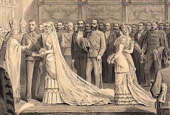 Cérémonie de mariage du prince héritier Rudolf avec la princesse Stéphanie de Belgique dans l'église des Augustins à Vienne, le 10 mai1881. Lithographie d'après un dessin de Jakob Eichhorn. . (© ÖNB)