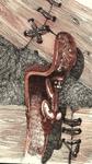 (dessin réalisé au Musée de Tahiti et des îles/ encre et aquarelle d'un pied d'échasse sur fond d'éléments de pirogue littéralement "cousus" avec des liens en fibre de coco tressée)Centre Polynésien des Sciences humaines. PK15, Punaauia, à la pointe des Pêcheurs. T 58 34 76, fax 58 43 00. Ouvert Tlj. De 9h30 à 17h30, sauf lundi. Entrée 500CFP/pers, enfants gratuits. Plusieurs petites salles ou sont présentés, le Milieu naturel, le peuplement des Archipels, géologie, formation d’un atoll, des archipels, cartes de Polynésie, la Culture Polynésienne ancienne, outillage vannerie, tatouage, habitat, navigation, guerre, religions anciennes…la période historique pré européenne, l’arrivée des missionnaires, la Dynastie Pomare, reconstitution de scènes coloniales. La muséographie date un peu et l’ensemble est resté très « scolaire ». On aimerait bien trouver le pendant du Musée Jean Marie Djibaou de Nouméa, réalisé par Renzo Piano en Nouvelle Calédonie. Un Grand Ensemble Culturel Polynésien fait cruellement défaut à Tahiti. Mais Hawaii n’est qu’à 6 heures d’avion, et on retrouve toutes les cultures du Pacifique à Oahu, au Polynesian Cultural Centre, où la Polynésie est évidemment très bien représentée.