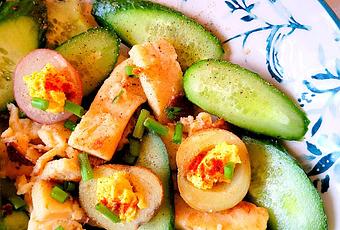 Les petits concombres des serres sur les toits de mon panier bio sont donc tombés à pic. J'en ai fait une espèce de salade aux allures presque de printemps.