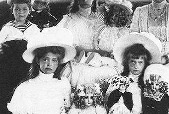 Le tsarévitch Alexis sur les genoux de l'empereur Guillaume II, et les membres de la Famille impériale russe en 1911.
