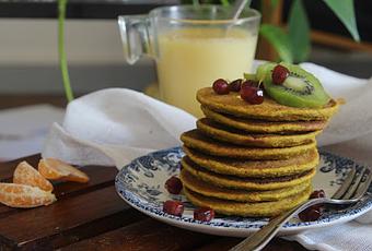 En ce moment, j'ai une passion pour le curcuma, j'en mets partout. Est-ce que c'est pour convoquer le soleil ? je n'en sais rien, si ce n'est qu'avec cette nouvelle passion, j'ai repeint la moitié de ma vaisselle et de mes ustensiles de cuisine... C'est donc presque naturellement que cette épice s'est glissée dans ma pâte, lorsque j'ai été prise d'une soudaine envie de pancakes le week-end dernier. J'étais pourtant partie sur une base tout à fait ordinaire de pancakes express (vous savez, cette recette de pancakes qui tourne un peu partout depuis quelques temps, à base de flocons d'avoine et de banane), lorsque ma main s'est presque naturellement portée vers le pot de curcuma... Du coup je me suis dit ensuite, que tant qu'à donner à mes pancakes une couleur jaune d'or, autant leur donner également la saveur de cette boisson tout aussi rayonnante qu'est le lait d'or, d'où l'ajout de gingembre, de cannelle, de cardamome sans oublier la pointe de poivre qui permet de profiter au mieux des bienfaits de la curcumine.