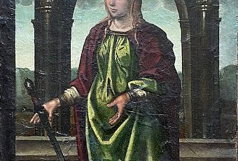 École de Castille, Zamora vers 1515 Quatre saints : Barthélémy, Jérôme, Sébastien, CatherineDeux paires de panneaux de pin Sainte Catherine (n° 180) - 72,5 x 51,8 cm Saint Jérôme (n° 178) - 69,5 x 51,2 cm Saint Barthélémy (n° 177) - 69,5 x 52 cm Saint Sébastien (n° 179) - 72,5 x 52 cm