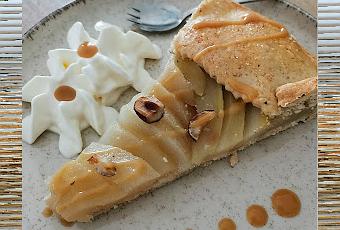 Pour 8 personnes : Pâte sucrée à la noisette: 290 g de farine, 150 g de beurre mou, 60 g de poudre de noisettes, 85 g de maïzena, 120 g de sucre glace, 2 petits œufs, 1 pincée de selGarniture : 40 g de poudre de noisettes, 6 poires, 75 cl d'eau, 200g de sucre, 1 gousse de vanille, quelques noisettes, lait + sucre pour la dorurePâte sucrée: