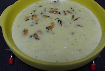 Faire un roux avec 30 grammes de beurre et 30 grammes de farine le laisser cuire à feu très doux pendant 10 à 15 minutes. Incorporez hors du feu 25 Cl de vin blanc sec et 30cl de jus de moules marinières réservé. Vous pouver ajouter aussi un peu de curry, curcuma ou de safran. Laisser cuire 10 minutes en remuant régulièrement. Ajouter ensuite environ 250 g de moules que vous avez gardée après une soirée "Moules marinières et frites".