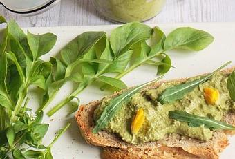 Servez en la tartinant sur du pain (ici du pain complet au levain naturel fait maison), avec la roquette, les fleurs d'ajonc, la valériane et le mouron blanc.