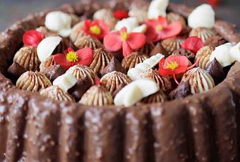 Le gâteau se compose d'une valeur sûre: un délicieux brownie bien moelleux que tout le monde aime. Il est recouvert d'un glaçage rocher, facile à faire et à réussir !! J'aime son côté légèrement croquant avec les grains de pralin dedans. J'ai ajouté un peu d'acidité avec une compotée de griottes, que vous pouvez remplacer par des framboises ou une très bonne confiture si vous voulez vous simplifier un peu le travail. Ensuite j'ai préparé 2 ganaches : une ganache classique au chocolat qui ressemble un peu à la truffe au chocolat en plus moelleux et une ganache montée au chocolat blond Dulcey. Pour la décoration, j'ai refait de la friture mais au chocolat blanc cette fois-ci.