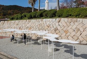 Le résultat de cette œuvre des architectes de Tato ressemble à des nuages. L’inspiration est venue des peintures japonaises traditionnelles. Les concepteurs japonais ont fait de cet espace ordinaire et habituellement peu esthétique un lieu spectaculaire où l’on peut enfin apprécier ce temps d’attente entre deux transports. Sur cette œuvre, certains disques irisés ont été ajoutés pour apporter un effet de lumière coloré qui se reflète sur le sol. Vue d’en haut, cette série de disques semble flotter au-dessus du sol. Ils rappellent également les nénuphars posés sur un étang de lotus. Avec cet arrêt de bus pas comme les autres, les architectes prouvent que l’aménagement urbain peut devenir aussi artistique que fonctionnel. Selon l’angle par lequel on admire cet espace, de nouveaux motifs à contempler s’offrent à nous. On constate aussi que les architectes ont joué sur les vides et les pleins, offrant des jeux d’ombres au sol qui évoluent avec la luminosité du moment. Le résultat est très poétique visuellement et offre un véritable lieu de vie pouvant accueillir du monde pour les heures les plus fréquentées de la journée.