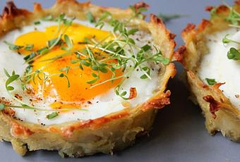 Retirez du four et garnissez les nids de dés de jambon et d’un oeuf. Enfournez pour 10 minutes, jusqu’à ce que le blanc d’oeuf soit pris.