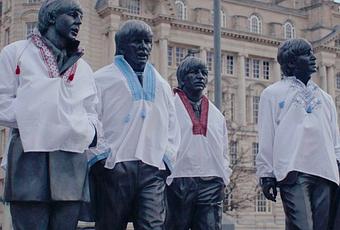 Les figures de Paul McCartney, George Harrison, Ringo Starr et John Lennon marchant ensemble ont été drapées de vyshyvankas blanches à Pier Head, Liverpool, avant le concours international de musique qui se déroulera le mois prochain dans la ville.
