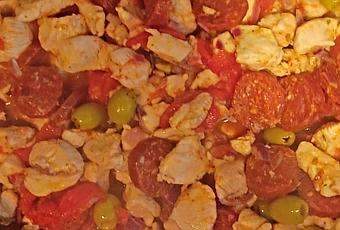 Recette pour 8 personnes du poulet sauté au chorizo, olives et tomates (tiré du site Ôdélices)