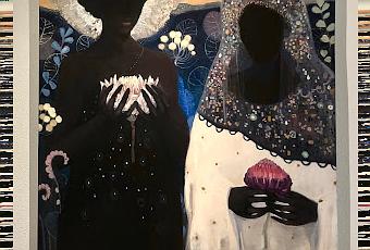 Dans la pièce voisine, il est évident que les tableaux de Leila Rose Fanner évoquent l’univers de Gustav Klimt bien que les couleurs qu’elle emploie soient moins vives. Pour elle, l’art est une célébration et elle peint des paysages oniriques inspirés notamment de habités par des silhouettes féminines noires.Métisse née en Californie en 1969, d'une artiste sud-africaine et d'un musicien afro-américain,élevée en Afrique du Sud, cette artiste, peintre et illustratrice, se promène entre paysages abstraits et figures ornementales, comme tissant une toile d’Afrique inspirée par l’art nouveau européen. Elle travaille actuellement dans son studio du Cap et utilise aujourd'hui l'huile et le pastel à l'huile sur bois et sur toile.Sa première exposition solo au Cap : " Superwomen ", fut organisée à la Kunsthouse Gallery de Kloof Street, au Cap, en 2008. Elle a reçu le Highly Commended Award lors du concours britannique Rise Art 2018. Ses peintures ont été publiées notamment dans le magazine Harlem Fine Arts, la galerie Vogue et SA Art Times. Ses œuvres font partie de collections publiques et privées en Afrique du Sud, aux États-Unis, au Royaume-Uni, en France, en Belgique, en Australie, au Kenya, en Suède, en Norvège et en Allemagne.