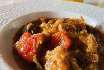 Ici, tout à cuit en même temps et les aubergines ont fondu et sont venues épaissir la sauce, mais pour un plat plus présentable vous pouvez singer avec 2 c à s de farine après le déglaçage, ajouter le reste des ingrédients sauf les aubergines qu’on viendra faire cuire au bout de 45 min afin qu’elles gardent de la tenue.