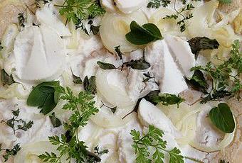 4) Ajouter de fines tranches d'oignons, des tranches de chèvre et des herbes ciselées