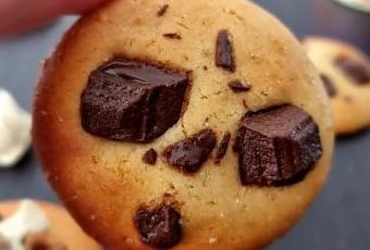 - Former les biscuits de la forme souhaitée, les déposer sur une plaque de cuisson puis ajouter le topping de votre choix, ici quelques noisettes coupées en 2 et de gros chunks de chocolat