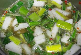 Ingrédients : 4 verts de poireau - 2 petites pommes de terre - 2 navets - 1 oignon - quelques brins de cerfeuil - 4 oeufs - 1 noisette de beurre - 2l de bouillon de légumes - 100g de noisettes - sel et poivre.