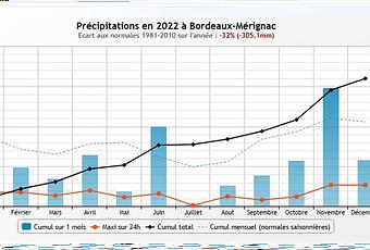 Il faut garder à l'esprit que les cumuls de précipitations mensuelles peuvent présenter des variations notables entre les appellations les plus à l'ouest près de l'estuaire et de l'océan et celles situées les plus proches de la Dordogne ( Francs -Côtes de Bordeaux par exemple ).