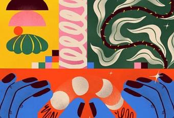 * la partie basse représente une main bleue, aux ongles peints, faisant la lune glisser, de pleine en quartiers.