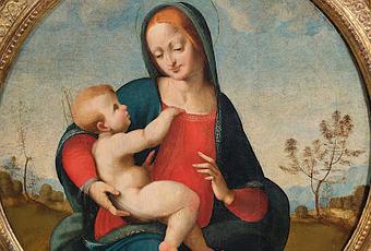 Ce tableau montre la Madone assise devant un paysage vallonné, tenant l'Enfant Jésus sur ses genoux. Les figures sont disposées de manière pyramidale équilibrée par les arbres en arrière-plan. La Madone est représentée de face, la tête légèrement inclinée et son expression sereine exprime une tendresse maternelle. L'Enfant Jésus apparaît de profil, se concentrant sur la Mère et tenant doucement sa robe rouge. Les personnages sont rendus de manière naturaliste et réaliste, avec une attention particulière portée aux drapés et aux plis vêtements de la Vierge.La composition peut être comparée à une Vierge à l'Enfant avec l'Enfant Saint Jean-Baptiste de Franciabigio au Musée des Beaux Arts de Dijon, en particulier les traits du visage des personnages avec le nez allongé et pointu de la Vierge, les cercles de lumière sous ses yeux et des ombres entre ses sourcils, ainsi que le nez arrondi de l'Enfant Jésus. Les deux peintures se caractérisent par l'utilisation par l'artiste de subtiles variations de tons et d'ombres douces pour créer une impression de profondeur et d'atmosphère.Selon Vasari, Franciabigio était un « excellent peintre » qui fut d'abord apprenti chez Mariotto Albertinelli. Par la suite, vers 1506, il établit un atelier commun près du Palazzo della Signoria avec son collègue Andrea del Sarto. Franciabigio a collaboré avec del Sarto pour embellir divers bâtiments florentins, publics et privés. Ces projets comprenaient des fresques à la Villa Capponi (1510), au cloître de l'église Annunziata (1513), au couvent de la Calza (1514) et au cloître de Scalzo (1516) et à la Villa Médicis, Poggio a Caiano (1520/21 ).Le style de Franciabigio se caractérise par sa remarquable capacité à capturer les effets de lumière et d'ombre dans ses peintures. Il a utilisé une palette de couleurs vives et dynamiques et a employé une perspective atmosphérique. Une telle virtuosité lui vaut une immense reconnaissance et fait de lui l'un des peintres les plus recherchés de Florence au cours de sa carrière.