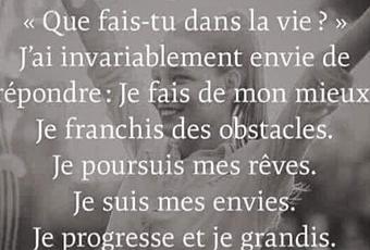 A la question «Que fais-tu dans la vie ?», j’ai invariablement envie de répondre : «Je fais de mon mieux». Je franchis des obstacles. Je poursuis mes rêves. Je suis mes envies. Je progresse et je grandis. J’apprivoise et j’apprends de la vie.