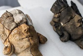 Les recherches ont livré cinq faces en pierre datant du Ve siècle av. Les visages sont idéalisés et ornés de bijoux. Leurs dos lisses indiquent qu'il s'agissait de reliefs. Cette récente découverte a été faite au cours d'une fouille sur une enceinte enterrée.