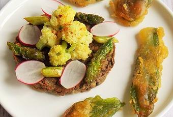 Aujourd'hui, je vous propose du Chou-fleur, asperges et radis sur galette croustillante aux lentilles, accompagnés de tempuras de fanes et d'ail des ours (Vegan) :