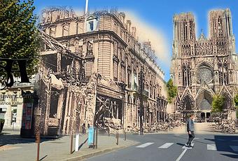 A noter, à gauche, le coin du "Grand Café Saint-Denis" qui faisait l'angle avec la rue Chanzy, qui ne sera pas reconstruit. Remarquez aussi le grand immeuble qui a perdu un étage et comporte un nombre de fenêtres différent entre l'avant et l'après.