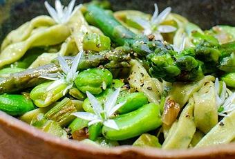 Début mai, l'ail des ours est en fleurs, je cueille les dernières feuilles de la saison... au même moment fèves et asperges vertes envahissent les marchés! A peine plus que ces trois ingrédients pour ce plat de pâtes très printanier: les pâtes fraîches sont parfumées dans la masse à l'ail des ours, servies avec fèves et asperges vertes à peine cuites pour en conserver toute la fraicheur! Un filet d'huile d'olive, et basta!
