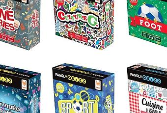 La collection Family Quizz est composée de plusieurs jeux, vous pouvez voir ci-dessous différentes couvertures de boîte : de la culture générale au sport, au foot, en passant par la cuisine, etc.