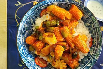 Répartir le riz dans 2 bols et garnir avec la préparation de seiches et légumes.