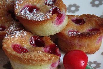 4) Répartir la pâte dans de petits moules en silicone et y enfoncer quelques cerises