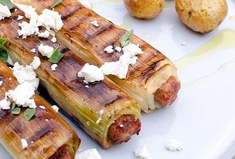 Et donc j'y pensais depuis un moment, j'ai saisi l'occasion alors qu'il me manquait des légumes 'classiques' à farcir. Le cœur du poireau coulisse assez facilement hors des couches cylindriques, pour laisser la place à une farce de viande et feta, qu'on introduira à l'aide d'une poche à douille, je ne conseille vraiment pas d'essayer à la cuillère!!