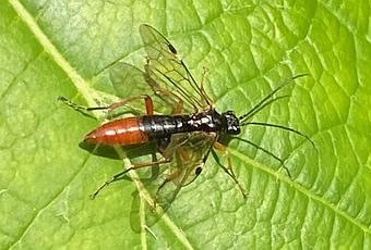 L'abdomen est largement attaché au thorax; Chez cette espèce de Tenthrède la coloration peut varier de l'orange au noir selon les sujets; L'abdomen est noir à la base et rouge à l'apex comme sur le spécimen en photo ci-dessus mais peut aussi avoir les tergites du milieu rouges.