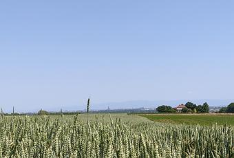 La photo le montre bien moins qu’une vidéo, forcément, mais le champ de blé juste devant moi ondulait sous le fort vent (il a fallu que j’enlève mon chapeau, sous peine de devoir lui courir après !) qui atténuait opportunément la chaleur qui nous enveloppait.