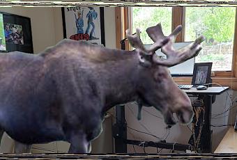 Je ne pas trop comment il y est parvenu, mais un grand orignal mâle s'est introduit à l'intérieur de ce qui semblait être notre maison de Park City. Par précaution, j'avais réussi à parquer l'animal à l'intérieur de mon bureau qui est relativement petit et j'avais soigneusement fermé la porte.