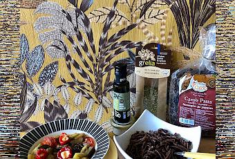 Je ne vais pas vous vanter un goût extraordinaire, mais plutôt la couleur originale et appétissante qui, de plus est naturelle puisque ces pâtes sont réalisées avec de la farine de caroube qui fut longtemps un substitut au chocolat jusqu'à ce qu'il soit découvert au Mexique.C'est un des produits que j'ai ramené de mon récent voyage en Crète et j'avais hâte de le tester parce que le producteur, avec qui j'ai eu l'opportunité de discuter, Caroub Creta, m'avait vraiment convaincue.