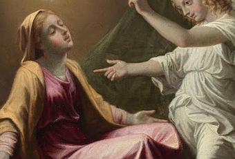Die Jungfrau Maria ist darin auf der linken Seite des Bildes dargestellt, auf einem Kissen sitzend, mit einem aufgeschlagenen Buch zu ihren Füßen. Der Erzengel Gabriel überraschte sie, als sie gerade las. Die Jungfrau hat die Augen geschlossen und die Arme in Ekstase der Anbetung und vollkommenen Annahme vor dem Engel zu ihrer Rechten ausgebreitet, der ihr verkündet, dass sie die Mutter Gottes sein wird. Gabriel deutet mit einem Finger auf die Jungfrau Maria und mit dem anderen auf den Heiligen Geist in Form einer Taube, die von einem doppelten Heiligenschein umgeben ist, was die Beziehung des Heiligen Lukas (1:35) veranschaulicht: "Und der Engel antwortete und sprach zu ihr: Der Heilige Geist wird über dich kommen, und die Kraft des Höchsten wird dich überschatten; darum wird der, der geboren werden soll, heilig sein und Sohn Gottes genannt werden. "