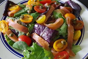 Ingrédients : 1 salade jeunes pousses - 1 tranche de saumon fumé - tomates cerises - câpres -
