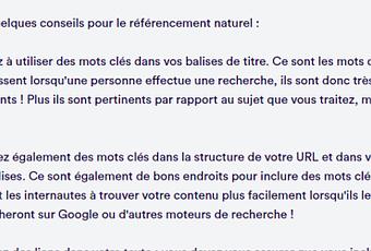 Voici, par exemple, les contenus générés par Copy.ai avec les mots clés "astuces pour le référencement naturel / astuces SEO / conseils pour améliorer son positionnement sur Google / améliorer sa visibilité sur google" :