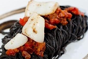 Colorer ses pâtes fraiches à l'encre de seiche c'est hyper-simple et assez drôle! Les sublimer avec un jus de crustacés très délicatement parfumé à l'anis, c'est absolument délicieux! Les accompagner d'un condiment de poivrons, tomates confites, et chorizo c'est surprenant, mais l'association est vraiment excellente et pleine de caractère!
