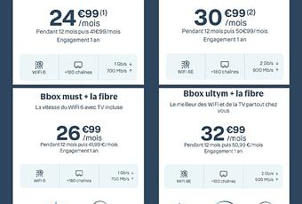 Ainsi, la Bbox Must passe de 24,99€ à 26,99€ par mois la première année et la Bbox Ultym passe de 30,99€ à 32,99€ par mois la première année. Le prix de la Bbox Fit reste quant à lui inchangé à ce jour.