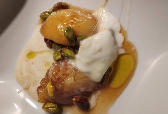 En revanche, nous n'avons pas placé de liquoreux sur les pêches même si la tentation était forte : les pêches ont été snackées avec des pistaches et du miel et au dernier moment une burrata a été fondue et accompagnée d'une huile d'olive.